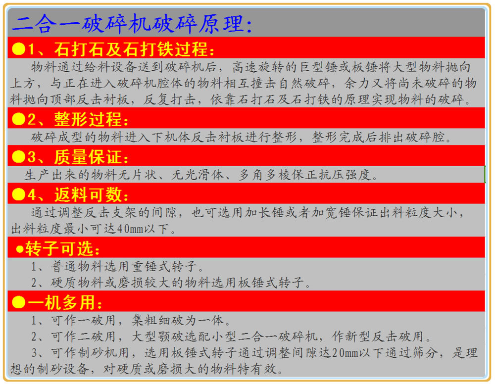 加強型設計:機殼比傳統(tǒng)反擊破加強設計制作,原裝選用國內(nèi)最好的板錘,大大增加了產(chǎn)品的使用壽命及配件的耐磨程度;